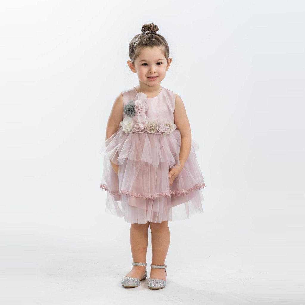 L'élégance à son meilleur ! Belle robe brillante avec des fleurs à la taille et un ornement floral amovible sur le haut de l'épaule droite avec un bas en tulle à plusieurs niveaux avec une bordure en dentelle. Une exclusivité JuniorKids